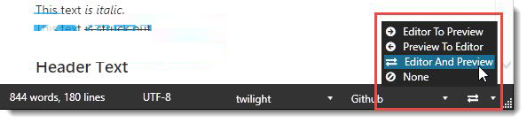 我们建议您主要使用EditorToPreview模式,并在查看文档时启用EditorAndPreview模式以执行特定任务。 请注意,您可以滚动编辑器以滚动预览,以便对所有情况都足够。