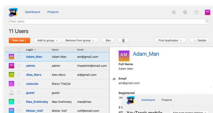 Hub管理用户,组,角色,权限和项目的单个数据库,并在所有连接的YouTrack和Upsource安装中共享,从而有效地充当身份验证和授权服务器。