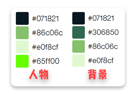 GameBoy 的屏幕仅支持显示四种灰度,因此在绘制素材时,我们也要谨记这一点。官方文档为背景素材提供了四种可以使用的颜色:#072821(黑色)、#306850(深绿)、#86c06c(浅绿)、#e0f8cf(白色),人物素材在这四色的基础上,删掉了 #306850(深绿),加上了 #65ff00 用于表示透明色。