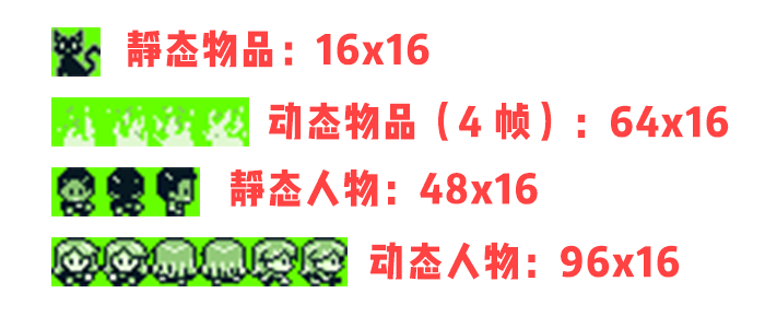 GB Studio 在素材格式上也有一定的限制。首先,素材必须是 PNG 格式。静止的物品素材为 16px × 16px,动态物品素材则在此基础上横向扩展,但必须保证高度维持在 16 像素。绘制人物素材的时候,则需要将其正面、背面和侧面都绘制出来,并拼合起来。背景素材至少需要达到 160px × 144px 的分辨率,最大不能超过 256px × 256px。