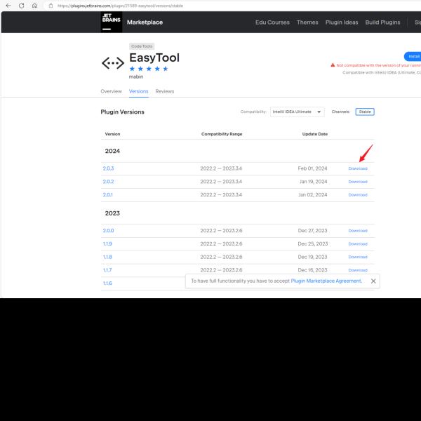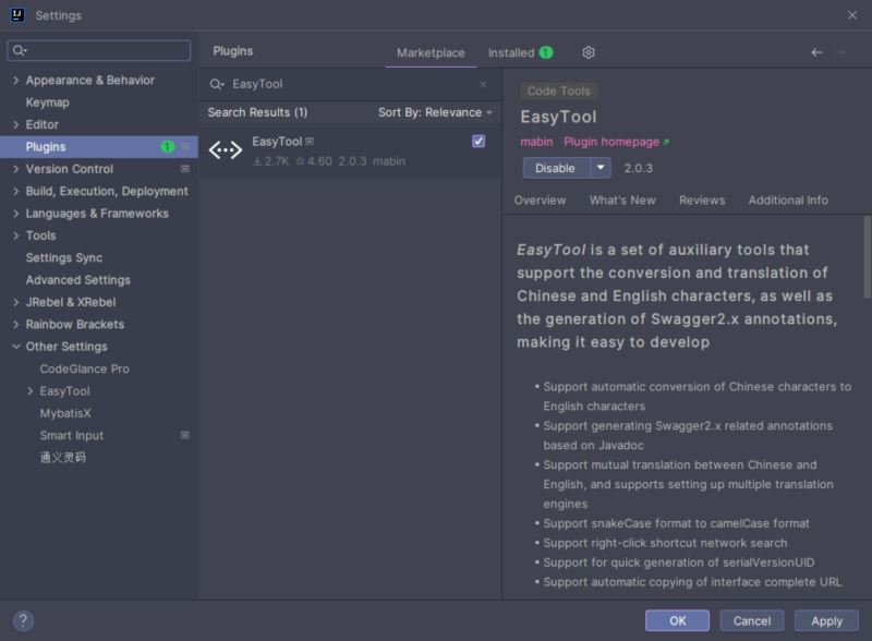 打开IDE的Setting页面并搜索Plugin,点击Marketplace,输入EasyTool,点击Install即可。
