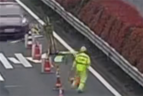 行车记录仪显示,车辆在撞击过程中未见明显减速,车速仅微降至87km/h时,与路侧一名施工人员擦身而过,该人员迅速翻越护栏避险,事故未造成人员伤亡。