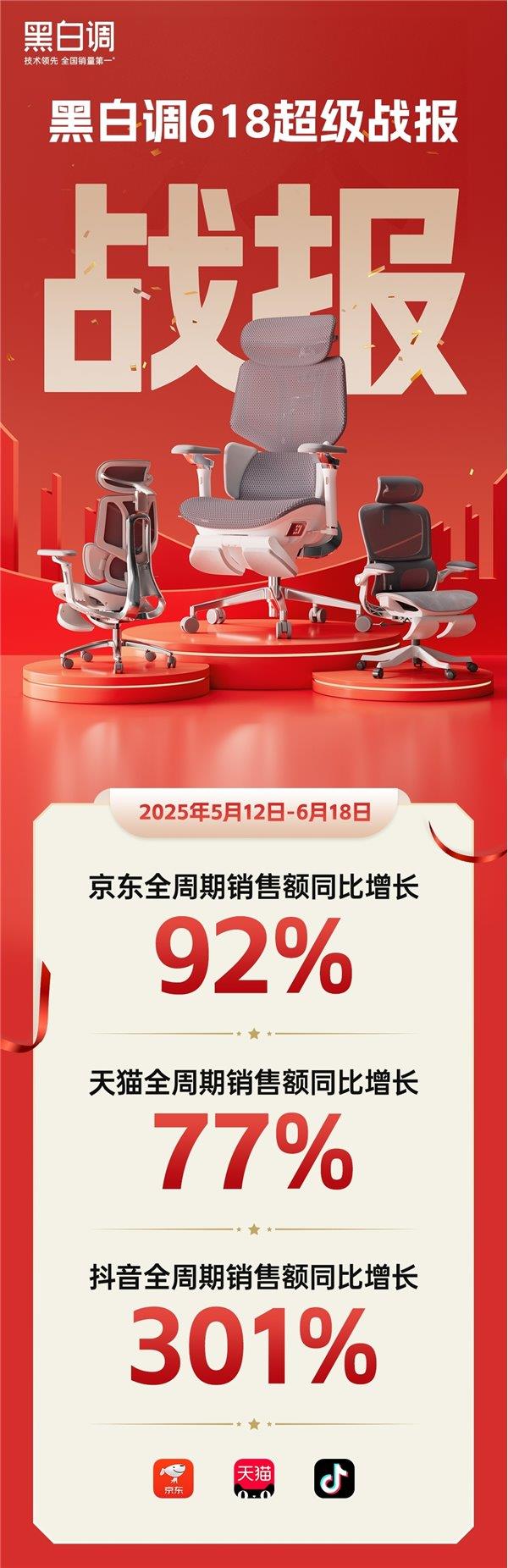 6月20日,史上最长618收官,各大行业品牌纷纷晒出了自己的销售“成绩单”。人体工学椅行业竞争剧烈,黑白调作为行业头部品牌,晒出多项增长战绩,与众多国货品牌一起,实现稳步增长态势,引领行业发展。