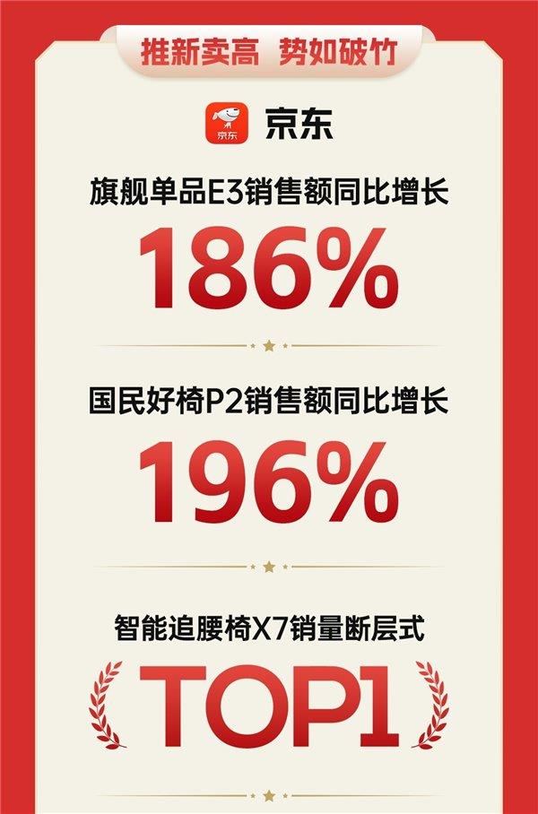 其中,黑白调京东渠道取得单品销售突出战绩:旗舰单品E3销售额同比增长186%,国民好椅P2销售额同比增长196%,智能追腰椅X7销量断层式TOP1,以智能人体工学技术开创行业新地位。