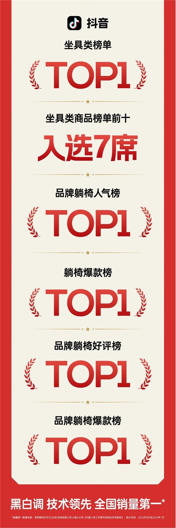 此外,抖音也贡献了众多榜单TOP1:坐具类榜单TOP1和“坐具类商品榜单前十入选7席”。黑白调以领先人体工学技术巩固了市场地位。同时取得品牌躺椅人气榜TOP1、躺椅爆款榜TOP1、品牌躺椅好评榜TOP1、品牌躺椅爆款榜TOP1,以领先产品力提供新的健康消费选择。