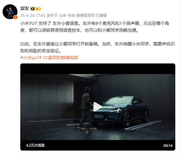电脑知识网6月24日消息,小米CEO雷军今日通过微博宣布,即将上市的小米YU7将支持车外小爱语音交互。