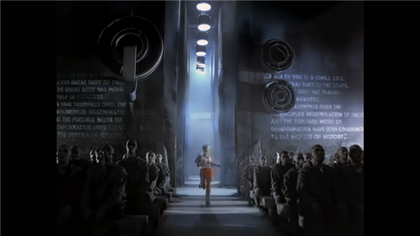 但真正让苹果封神的,还得是 1984 年的那个广告,一个穿着白色背心的女运动员,冲进一个全是光头、盯着大屏幕看的礼堂,把锤子砸向屏幕,老大哥的演讲戛然而止。