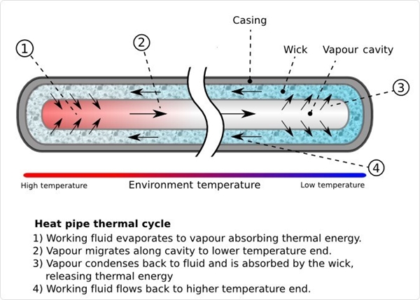 当靠近芯片的一端温度升高时,液体受热蒸发为气态,蒸汽沿管内空间快速流向温度较低的另一端;到达冷端后蒸汽冷凝为液体,通过吸液芯的毛细作用回流至热端,如此往复循环。