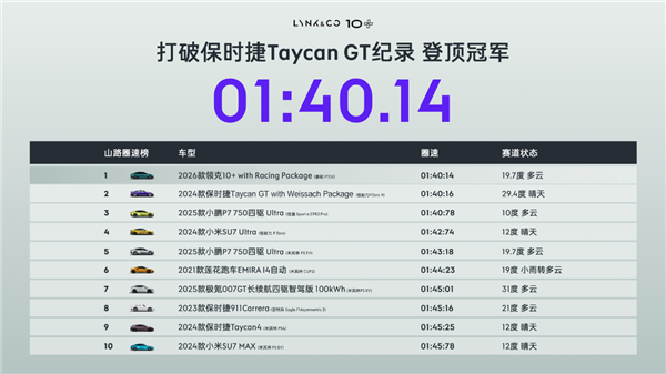 更值得一提的是,领克首次以“+”之名打造的极致运动座驾领克10+,联合领克汽车运动的赛道级调校并在官方性能套件的赋能下,以1分40秒14的山路圈速成绩超越保时捷Taycan GT,取得亚洲山脊赛道圈速第一并登顶“弯道之王”。