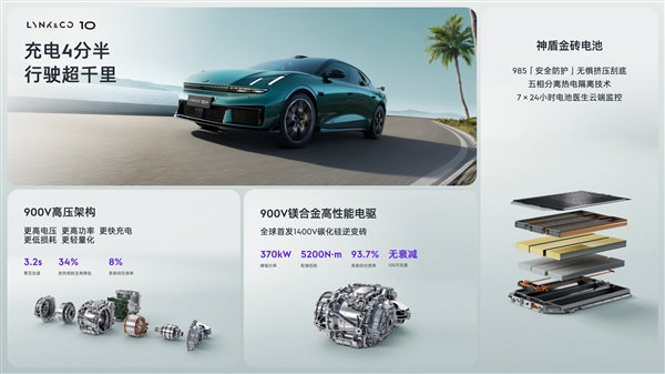 电池层面,领克10搭载的800V 77度神盾金砖电池,充电倍率5.5C,10.5分钟即可完成SOC10%-80%,同级领先。