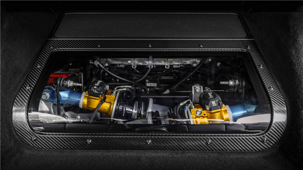但在经过扩缸、镗缸等一系列操作之后,这台 V6 发动机的排量已经来到了 3.8L ,在一个巨大的涡轮加持下,它的最大马力已经超过了 800 匹,是同重量 “ 纽北大魔王 ” 保时捷 GT2 RS 的近乎两倍。