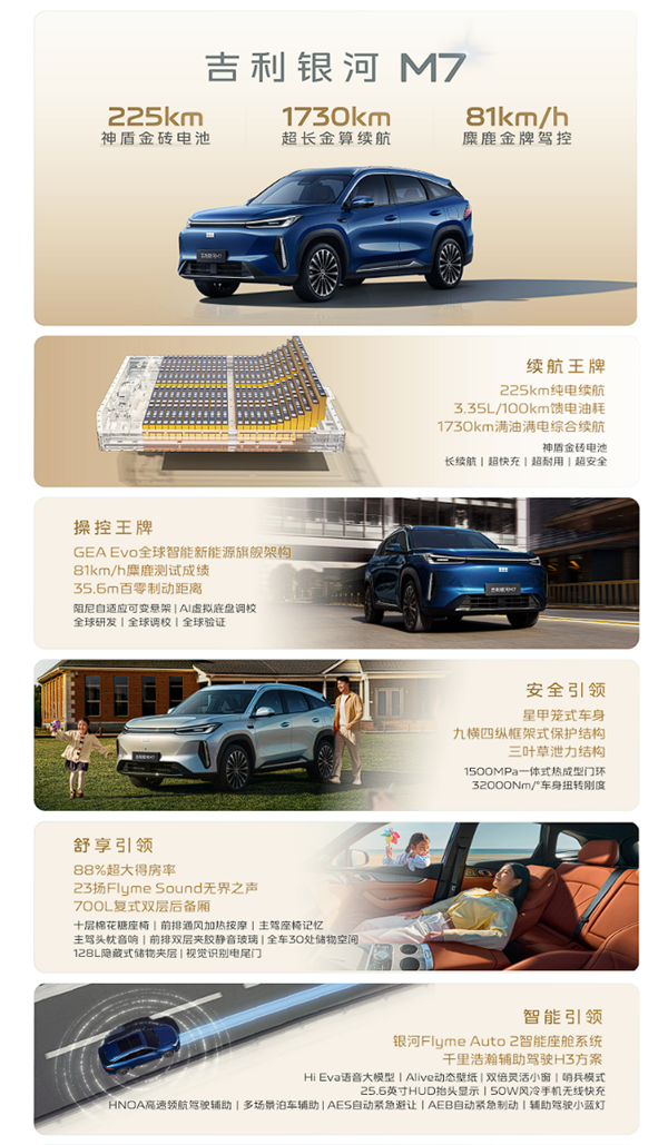 动力方面,新车采用插混系统,由1.5L雷神EM超级电混发动机+单机组成,馈电百公里油耗3.35升,全系搭载神盾金砖电池,银河M7配备了18.4kWh和29.8kWh两种容量,最大CLTC纯电续航225km,CLTC综合续航1730km,同级领先。