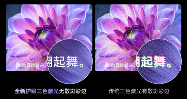 众所周知纯三色激光的色彩比较鲜艳,但正是因为过饱和的颜色,外加上散斑和色边,即便不是近视眼,眼睛看久了也会出现视觉疲劳的问题,而且即使有莱茵护眼认证,也没有办法解决散斑和色边带来的影响。大家在网上搜“纯三色激光”关键词,其实就会看到很多网友购买纯三色激光后,眼睛出现“流眼泪”、“疲劳”等问题,如果有干眼症,症状也会加重。