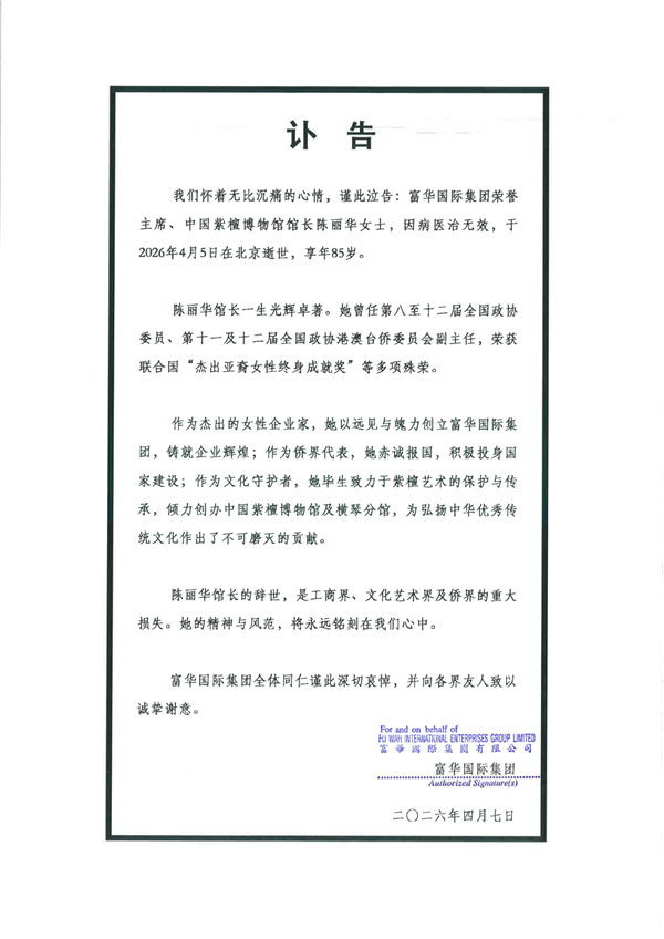 4月7日消息,今日,富华国际集团官网发布讣告:富华国际集团荣誉主席、中国紫檀博物馆馆长陈丽华女士,因病医治无效,于2026年4月5日在北京逝世,享年85岁。 目前,富华国际集团官网页面已变黑白。