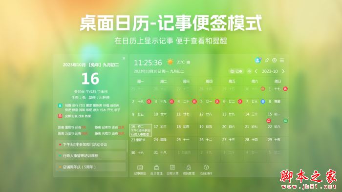 桌面日历:美观的界面,让日历非常完美的融合到桌面上,支持日历界面和日历记事界面;