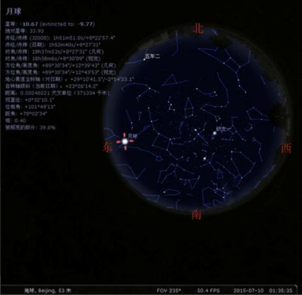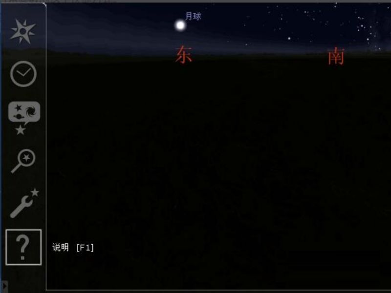 以“月球”为例,先用左键点它,显示选中状态,左上角会显示出与所选星星相关的信息。在屏幕任意处,按右键,取消选中,返回未选择状态。