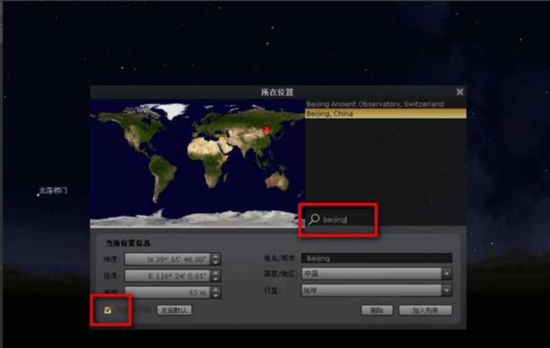也可以用鼠标在地图上用左键点击,选中的地方就是观测地点。