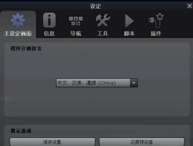 进入“设定”窗口后,在下拉菜单中找到中文,选中它,软件变成中文显示。不用保存,再进入软件时显示的也是中文。也就是说,选中语言后,该语言就成为了默认语言。