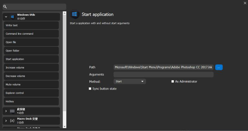 1、利用【Start application】打开快捷方式。如PS的快捷方式是在【C:\ProgramData\Microsoft\Windows\Start Menu\Programs\Adobe Photoshop CC 2017.lnk】,在添加【Start application】动作时,Path路径输入【C:\ProgramData\Microsoft\Windows\Start Menu\Programs\Adobe Photoshop CC 2017.lnk】,就可以快捷打开Photoshop