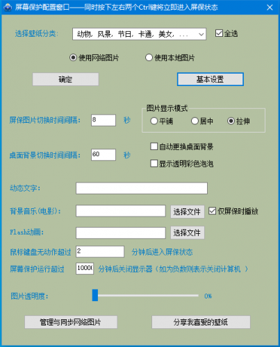 电脑动态屏保专家软件支持七彩透明泡泡、海底世界动画、夜光钟、背景音乐、自动切换桌面壁纸、一键进入屏保等多种功能。