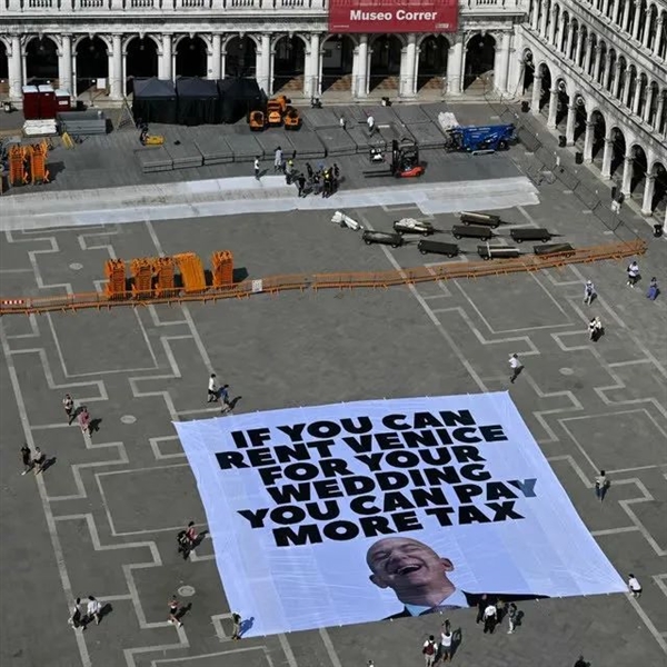 从上周开始,大批抗议人士就开始在威尼斯持续组织各种抗议,公开抵制贝佐斯的此次婚礼。威尼斯各大标志景点,到处都可以见到贝佐斯的闪亮光头。在Rialto桥和婚礼举办的教堂,抗议者悬挂横幅“这不是贝佐斯的地方”;在圣马可广场,抗议人士打出巨幅标语,“如果你租下半个威尼斯来举办婚礼,你就应该多交税。”