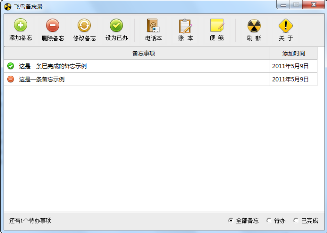 我们日常工作生活中事情一多就会忘事,有时候重要的事忘记了事后那是无比的麻烦,所以经常把要做的事记录下来是个好习惯,这款飞鸟备忘录可以让你对资料进行备份以免忘记。 软件介绍: 飞鸟备忘录是一款非常简单的桌面备忘录软件,该软件可以帮助用户对账目、电话进行备忘,还可以作为便笺使用,使用方便,操作简单,是用户进行备忘的好帮手。 软件截图 备忘录 飞鸟
