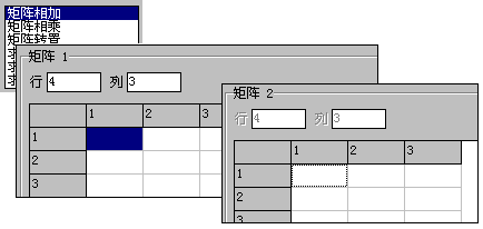 这便是选择了运行矩阵乘法后的效果。图中可以看到,矩阵2的行已经不能更改,并将自动与矩阵1的列保持同步,而且矩阵2的列仍能更改。运行后的结果将是一个与矩阵1行数相同,与矩阵2列数相同的新矩阵。根据程序的默认设置,运算后的输出结果将被发往矩阵1,覆盖掉原有的数据,并将矩阵2清空以便进行下一次运算。