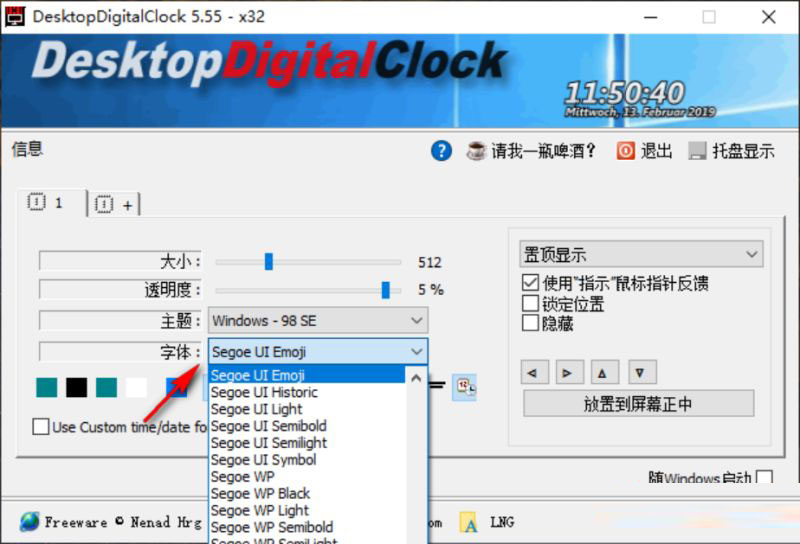 2、支持大小设置功能,可以在软件自由控制数字时钟显示大小