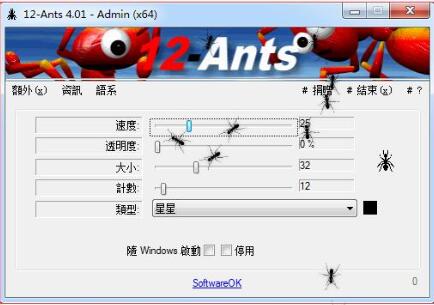 12-ants是一个仅16kb大的单文件绿色程序。运行后,桌面上立刻多了12只爬来爬去的小蚂蚁。说是12只,实际上,可以设置更多,比如20只、30只……最多可以放50只蚂蚁在桌面上。