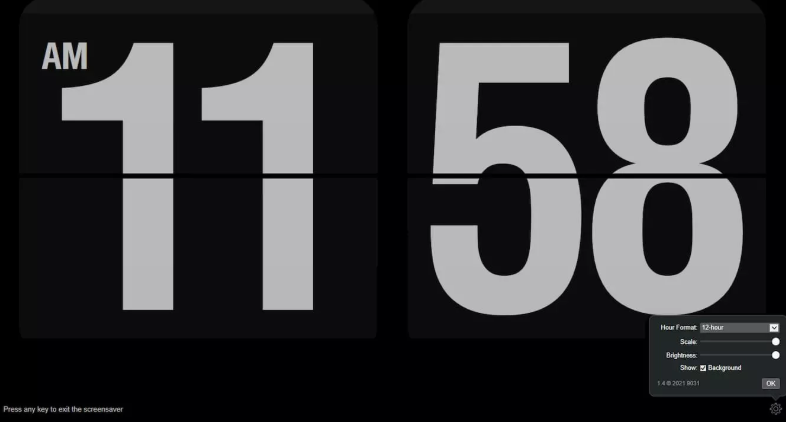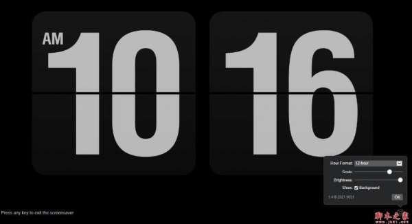 启用 Fliqlo 后,可在右下角设置 12/24 小时,调整亮度、大小,以及是否现数字后面的背景。