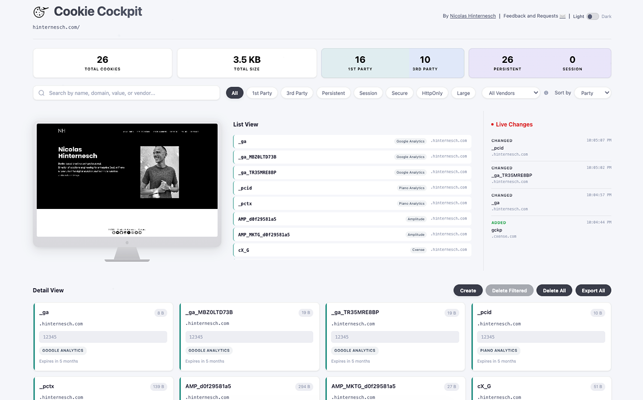 在干净的列表视图和高级详细视图中查看当前站点的所有 cookie。按域、名称、值或供应商过滤、排序和搜索 cookie。优雅的现代设计,完全支持深色模式。