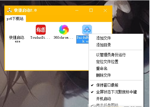 快捷启动这个小工具是个简单方便的快速启动软件,你可以随意你在里面添加你想要一键启动的程序文件,之后即可快捷启动了,软件内存占用非常小只有1-3MB,而且没有多余功能。