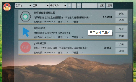 国王软件工具箱其实是一个桌面工具集合,这里收录了各种日常电脑使用过程中会用到的一些软件,为各大工具提供功能性的扩展,如视频播放、图片查看、VX、简易浏览器、动态壁纸、弹窗和进程拦截、快速下载等。为用户提供快捷,绿色的软件环境!