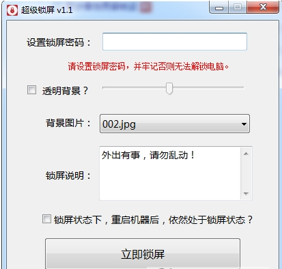 超级锁屏是一款非常给力的电脑锁屏软件,这里免费送给大家实用,这款可以选择在锁屏状态下重启机器是否依然处于锁屏状态,设计非常人性化,同时还可以自定义锁屏壁纸,还可以设置透明度,有需要的朋友欢迎体验。 使用说明: 设置锁屏密码,调整背景图片,锁屏说明,开始锁屏 锁屏效果 更新日志: 锁屏主界面布局修改 DIY组件优化扩展 锁屏软件 超级锁屏