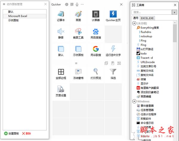 例如你可以专门设置一个Excel的快捷面板,可以根据Excel添加一些对应动作,当你在使用Excle时呼出Quicker,即可方便的使用设置好的动作,例如全部边框、打印预览等。