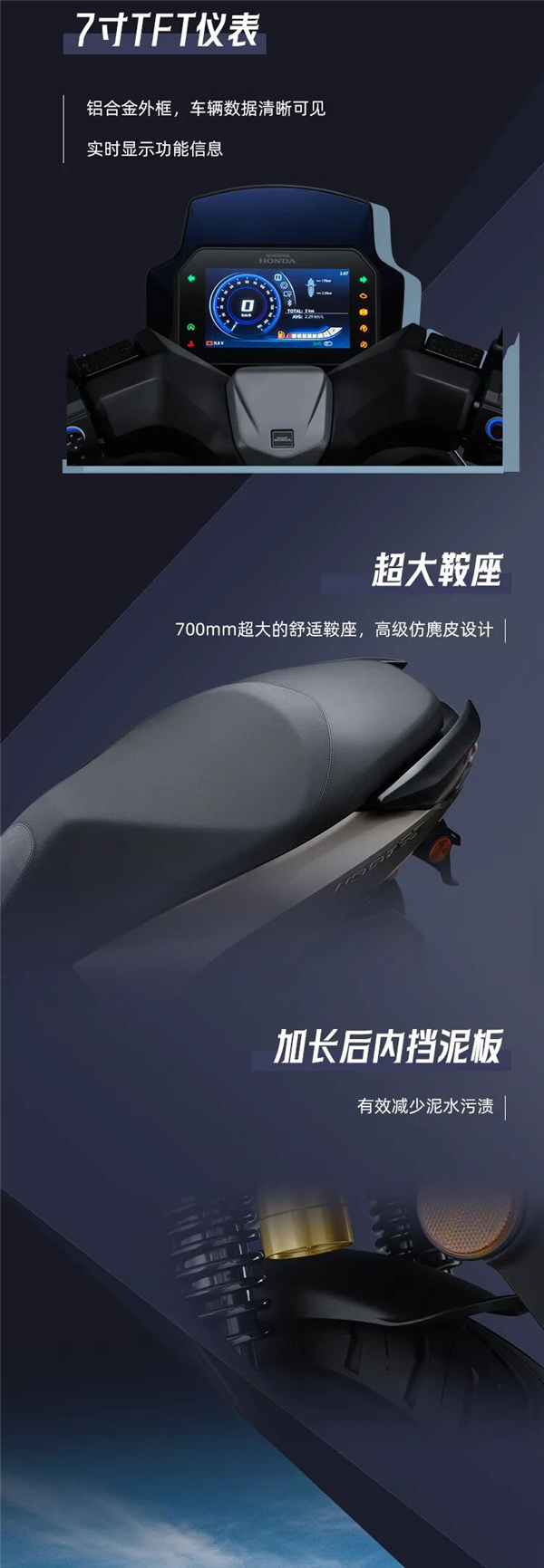 动力方面,该车搭载本田SH-EP150单缸水冷四气门发动机,排量149.7cc,最大功率11.4kW,峰值扭矩14.4N·m,具备静音启动与自动启停功能,百公里油耗约2.2L,8L油箱续航可达370km。