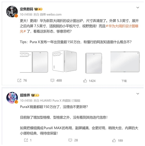 时隔一年,华为即将推出该系列的进阶力作——全款阔折叠屏Pura X Max。作为行业内首款大屏阔折叠机型,它将外屏尺寸升级至5.3英寸,内屏尺寸更是大幅增加到了7.5英寸。