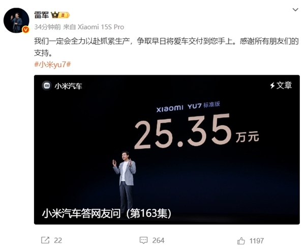 “我们一定会全力以赴抓紧生产,争取早日将爱车交付到您手上。再次感谢所有朋友们的支持。”雷军在转发上述消息时表示。