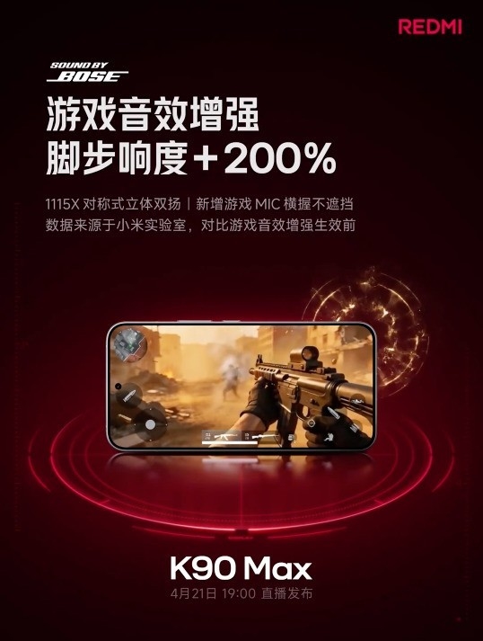 与此同时,REDMI K90 Max还在音频体验上继续向游戏场景靠拢。资料显示,新机将搭载1115X对称立体双扬,并由Bose联合调音,重点强化脚步声和空间方位感。