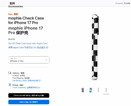 mophie全新Check Case for iPhone 17 Pro保护壳正式推出,售价59.95美元(折合人民币约400元),这款保护壳采用黑白棋盘格设计,边角圆润,侧边配有黑色Action按钮、音量键与Camera Control按钮,底部印有mophie标识,背板预留摄像头开孔。