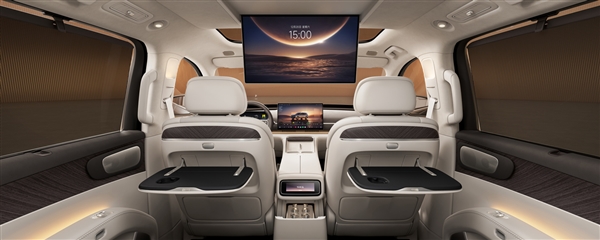 新车后排提供6英寸多功能控制屏+21.4英寸3K电动娱乐屏,莱茵低蓝光认证,同时还提供了小桌板、8.1L的冷暖箱(-6°C至50°C宽温域调节)、遮阳帘、全景天幕以及双层玻璃车窗等,并标配23扬声器(含2个主驾头枕音箱)Leap Sound音响系统,峰值功率达2304W。