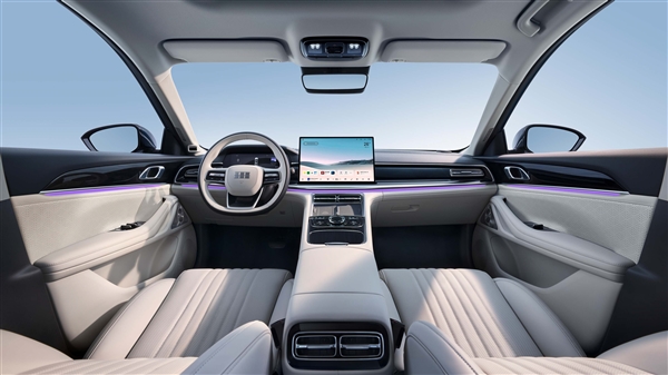 内饰采用环抱式座舱布局,大面积软质材料包覆,顶棚超2㎡一体成型,搭配皮质座椅、木纹/金属饰板,配备10.25英寸全液晶仪表+15.6英寸悬浮式中控大屏,搭载银河Flyme Auto 2智能座舱系统,支持四音区语音识别、连续对话、场景模式一键切换、手机App远程控制等。