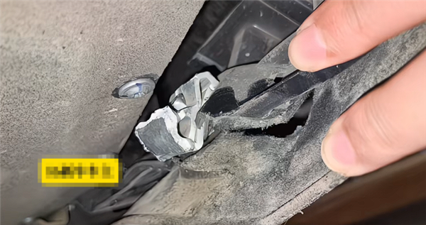 包小可4月17日消息,据博主“汽车人一零”近期爆料,有杭州一电动车车主驾驶刚提一个月的新车 ,在停车场碾压一块地砖时,翘起的地砖磕碰到车辆底盘,导致电池包外壳上一个与轮眉连接的塑料卡扣断裂。