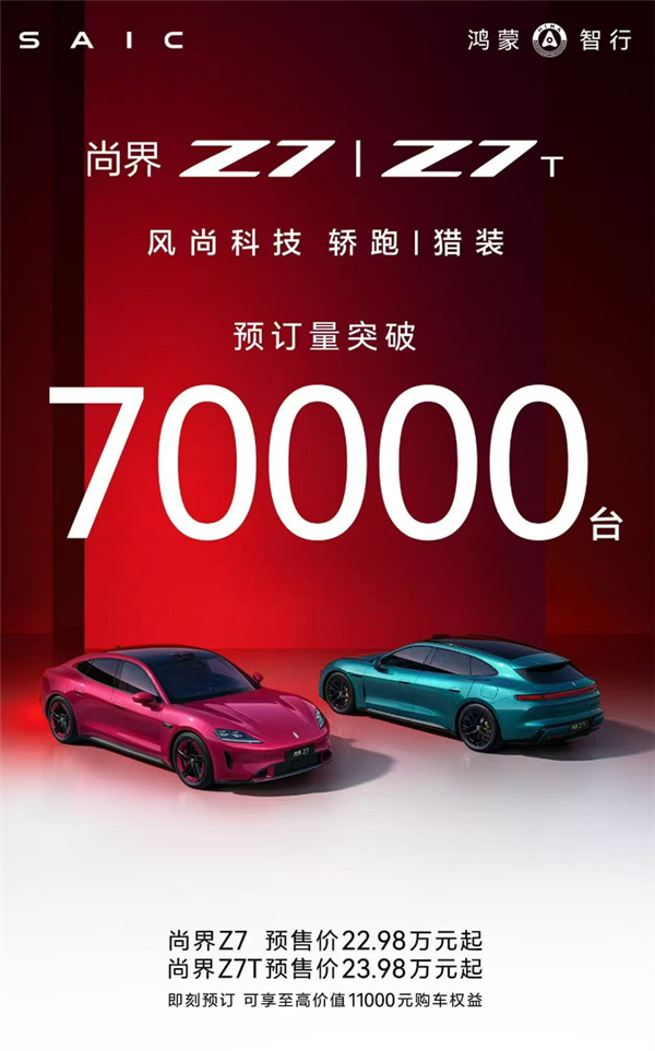 包小可4月18日消息,据鸿蒙智行官方数据,自开启预售以来,尚界Z7、Z7T双车已经取得了超7万台的好成绩,该车将于本月22日晚上市,届时会正式公布最终售价。