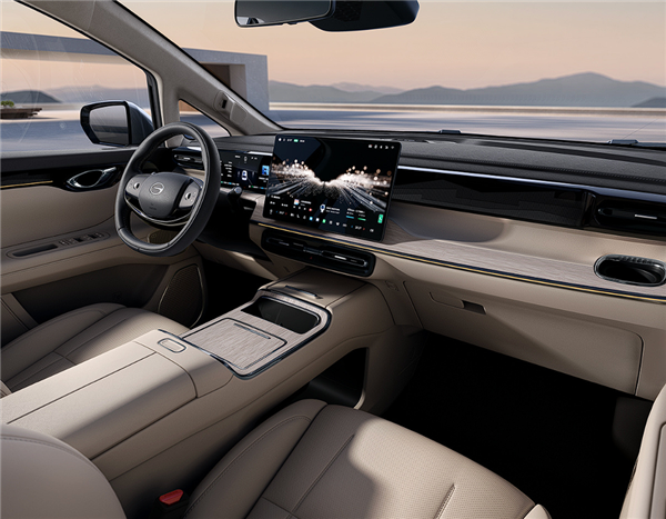 和大多数新能源一样,新车内饰风格也走的是简约科技路线,全系标配10.25英寸仪表屏与15.6英寸悬浮式中控屏、电子怀档杆,并采用2+2+3的七座布局,其中二排座椅配备通风、加热和按摩功能,还提供小桌板、三温冰箱与17.3英寸后排娱乐屏可选装。