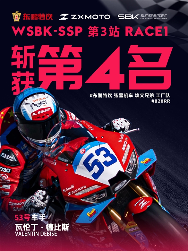 包小可4月19日消息,在2026世界超级摩托车锦标赛(WSBK)荷兰站正赛中,张雪机车队53号车手瓦伦丁·德比斯因最后一弯道违规,被官方处罚,从原本的第三名降至第四名,无缘领奖台。