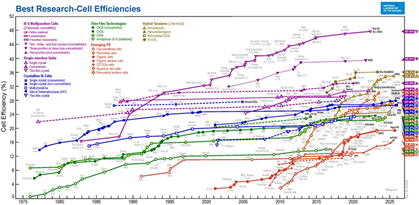 美国国家可再生能源实验室每年都会发布目前太阳能电池最高效率的折线图,实验室条件下都很难干出超过 40% 的转换效率