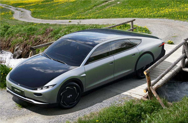 这车叫 Lightyear 0,是全球第一辆量产的太阳能汽车,为了美观侧面没贴 “牛皮藓”,太阳能板安装在了前舱盖、车顶、溜背上,面积是 5m?,户外停一天能补充 70km 续航。