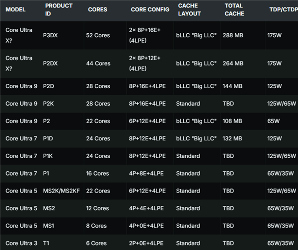功耗方面,旗舰型号最高TDP 175W,其余型号的TDP则从35W到125W不等。入门级Ultra 3和Ultra 5的TDP为35W,解锁版最高可达65W。标准版的TDP为125W,部分型号还提供65W的节能版本。