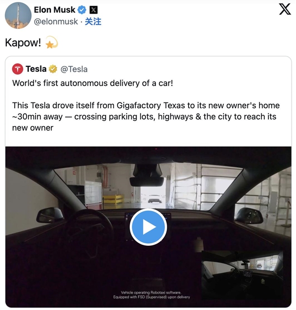 马斯克先是郑重其事发了一条推文,宣称特斯拉完成了“史上第一次”完全自动驾驶的车辆交付。